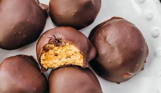 An easy 4-ingredient recipe for no bake low carb keto chocolate peanut butter protein balls! A thick and fudgy peanut butter center, covered in a sugar-free chocolate. These 5-minute keto chocolate peanut butter fat bombs are a quick healthy dessert or protein-packed snack with a peanut-free option! Paleo, Vegan, Gluten Free.